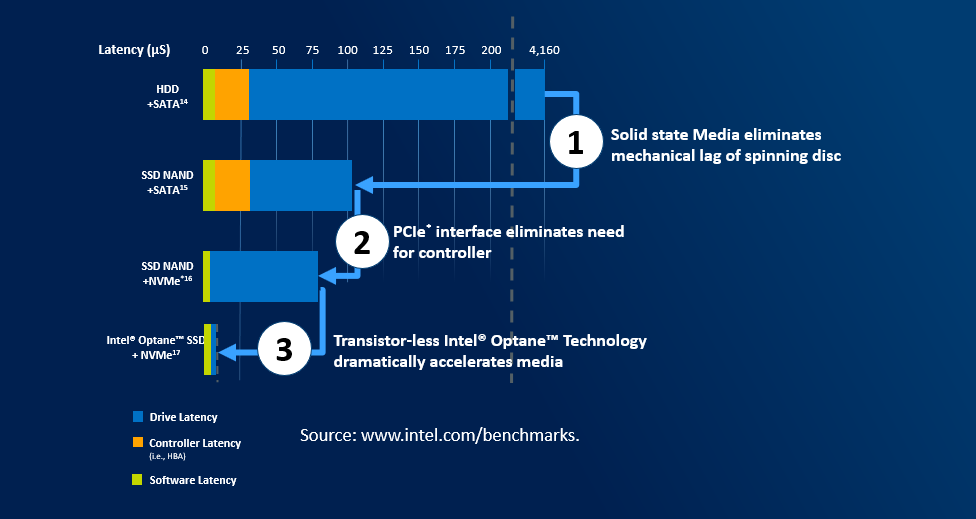 Another significant leap was introduction of Intel Optane SSD, that introduces even lower latencies than NAND SSDs. And since in Optane media is bit addressable, there is no garbage to collect (on NAND SSD you erase only in blocks with negative performance impact).